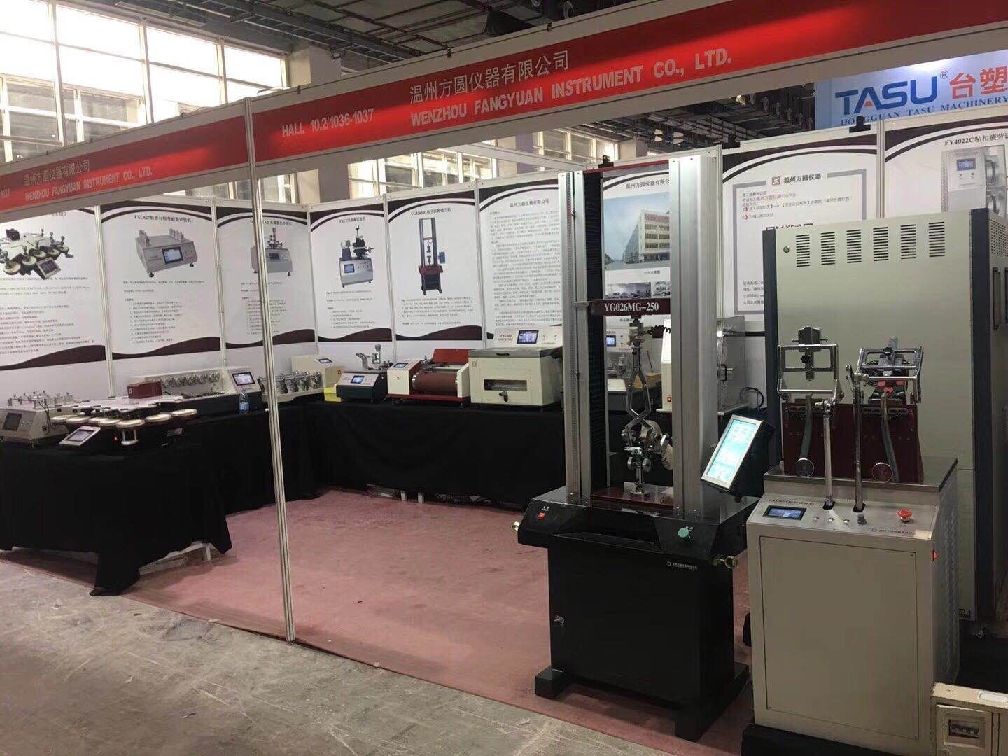 溫州方圓儀器有限公司應展覽會主辦方邀請,參加此次展會,并實物展出了:FY600日曬氣候老化儀、YG028萬能材料試驗機、FXC651耐折試驗機、YG401FII織物平磨儀、XGMCIIA皮革摩擦色牢度儀、FXC621耐磨試驗機、FXC171剝離試驗機、FXC623鞋用纖維曲撓儀、FXC627鞋帶與鞋帶耐磨試驗機等16種鞋類、皮革檢測儀器。